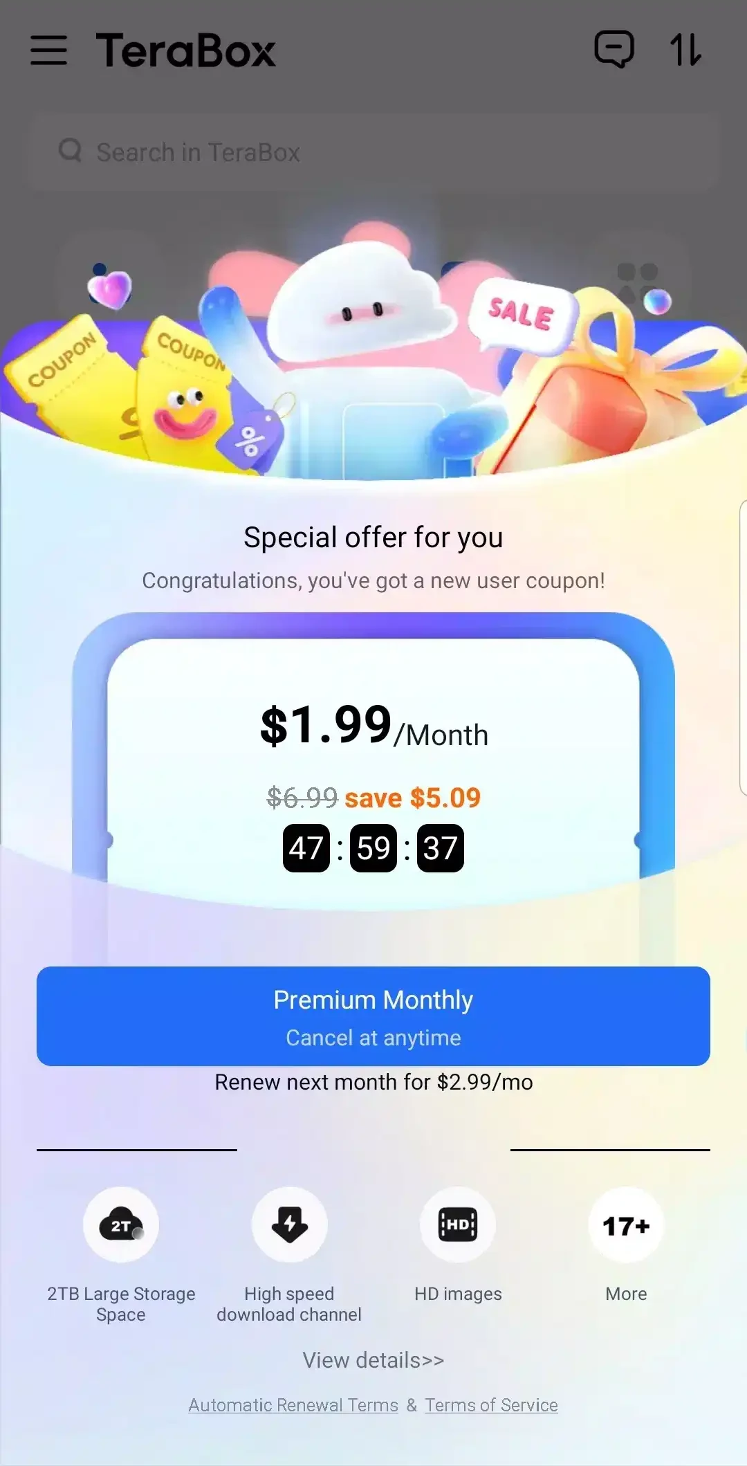 TeraBox 提供 1TB 的免费云存储空间,但功能有限。这足以满足个人使用,但升级到高级版后,您可以提升工作效率,因为它将为您提供双倍云存储空间和多项高级功能。您可以享受高速上传和下载、上传大文件、享受高清视频播放等等。
